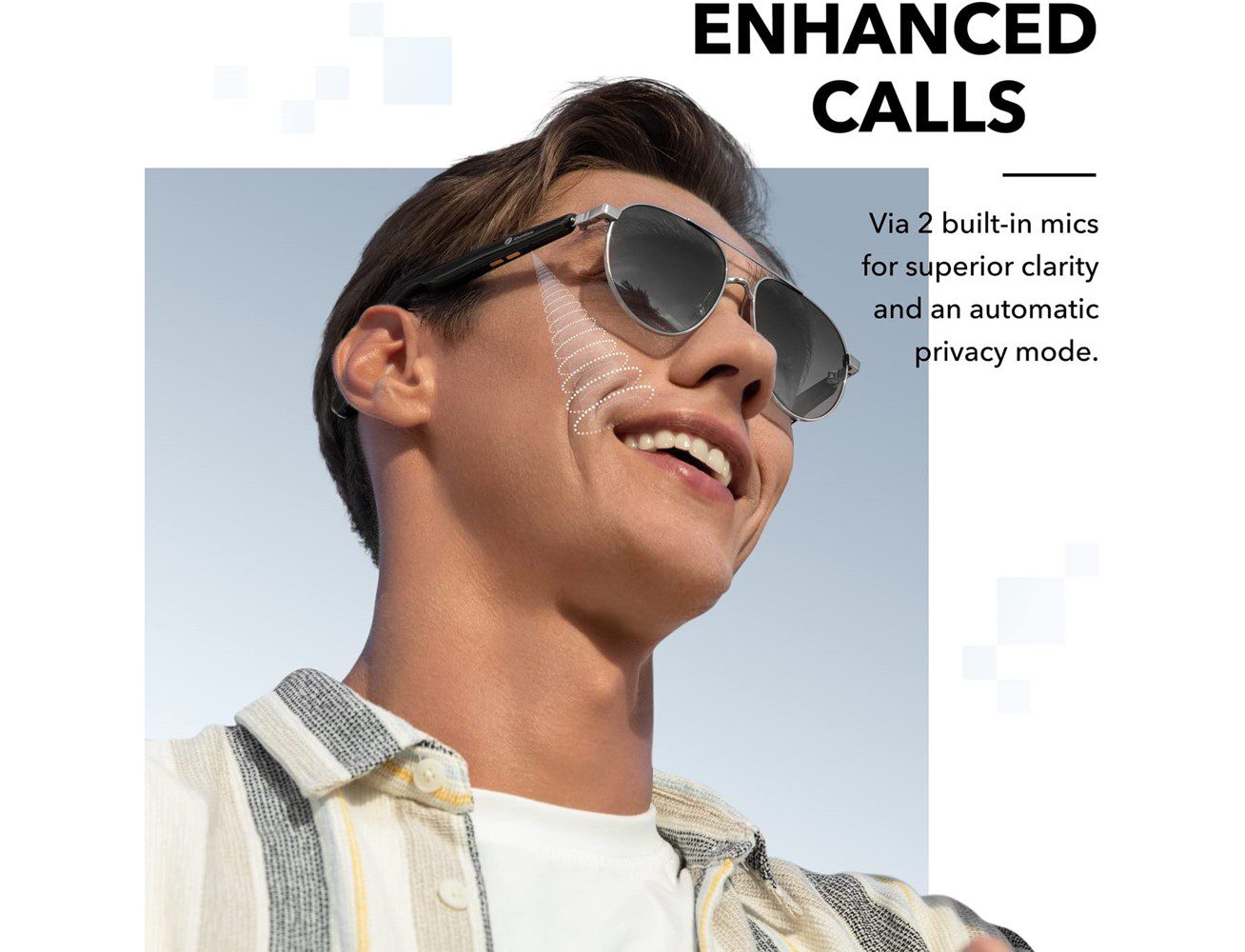 نظام صوتي محيطي مفتوح، 4 مكبرات صوت موضوعة حول أذنيك للحصول على تجربة استماع مصممة خصيصًا، اختر من بين 7 مستويات، 2 ميكروفونات تعمل جنبًا إلى جنب مع خوارزمية تقليل الضوضاء، تجمع بين إطارات أنيقة من الفولاذ المقاوم للصدأ مع عدسات مستقطبة، يمكنها حجب ما يصل إلى 99% من الأشعة فوق البنفسجية فئة A وB. – & تحطيم مقاومة. مواد خفيفة الوزن، ومفصلات مرنة تصل إلى 8 درجات، 10 دقائق من الشحن تمنحك 90 دقيقة من التحكم في الاستماع عبر تطبيق Soundcore