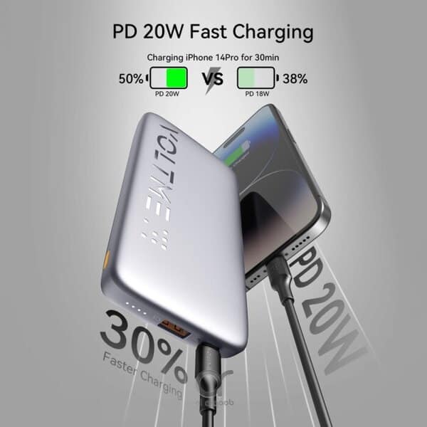 باور بنك VOLTME مزود بخاصية إخراج محدثة 22.5 واط وتقنيات الشحن السريع PD 3.0 و QC 3.0، مما يوفر شحناً فائق السرعة.