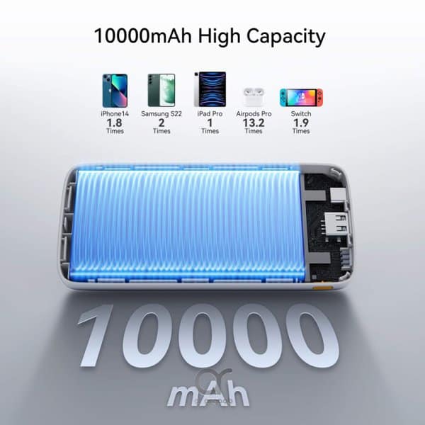 يوفّر حتى 2.5 شحنة كاملة لـ iPhone 15، و شحنين لـ Samsung Galaxy S24، مما يضمن بقاءك متصلاً طوال اليوم.