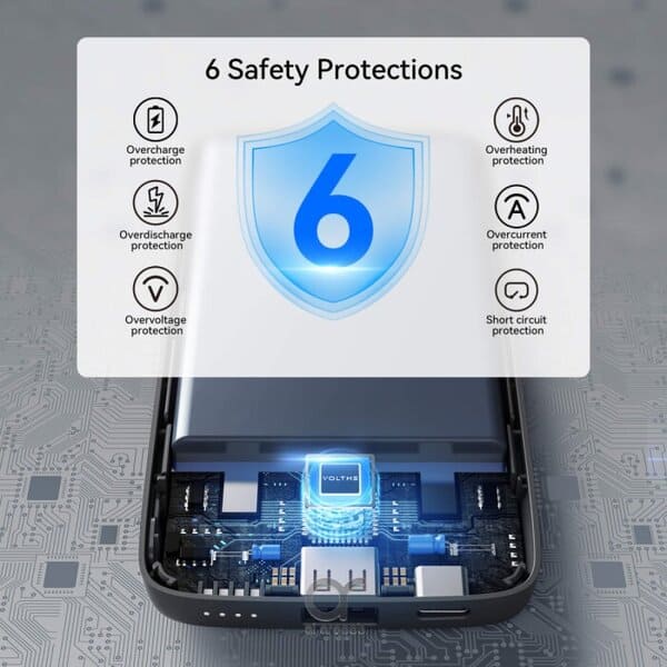 مزود بأنظمة حماية متقدمة تضمن شحناً آمناً دائماً، مع حماية أجهزتك من الشحن الزائد، ارتفاع الحرارة، وقصر الدائرة.