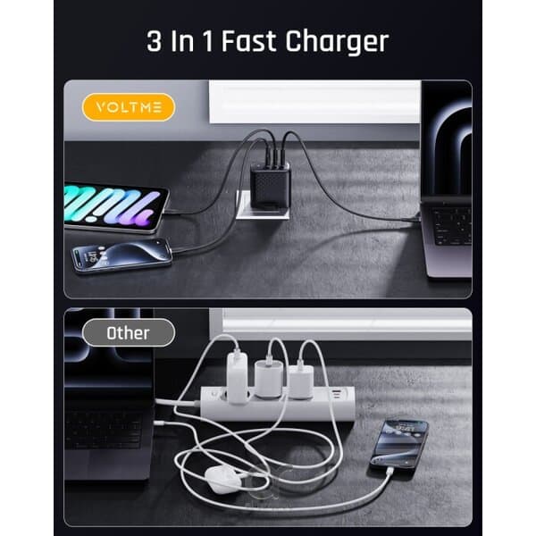 سهل الاستخدام للجميع: شاحن الحائط من VOLTME أصغر بنسبة 38% من الشواحن التقليدية. يتميز بخفة وزنه وسهولة حمله، كما أنه لا يشغل سوى مساحة صغيرة جدًا.