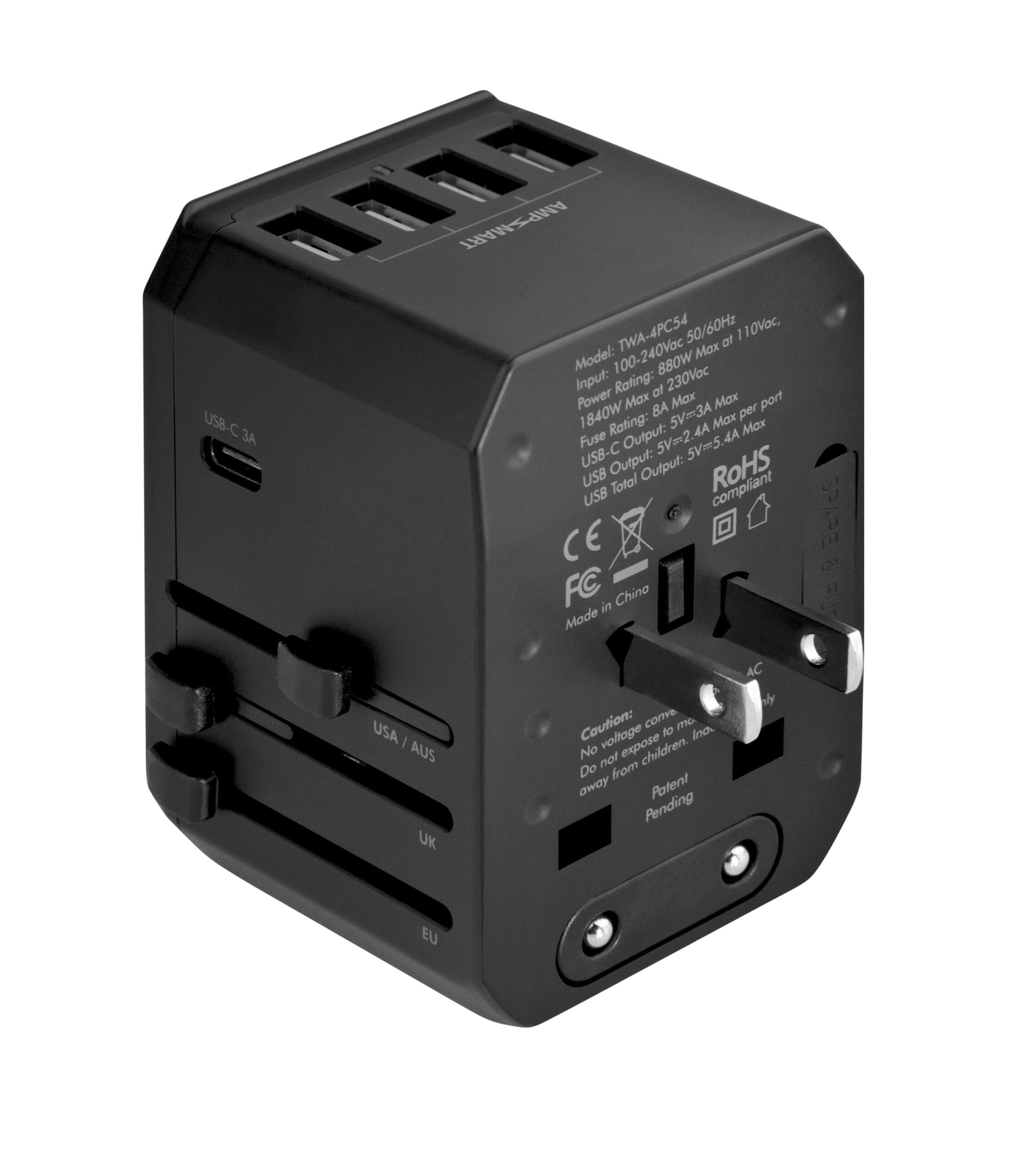 4 مهايئ سفر USB-A + 1 USB-C متوافق مع الولايات المتحدة / المملكة المتحدة / الاتحاد الأوروبي / الاتحاد الأوروبي / آسيا • تكتشف تقنية AMPSMART احتياجات الطاقة للأجهزة لتقديم أسرع شحن • نظام قفل التوصيل ومصراع الأمان لضمان الاستخدام الآمن • فتيل 8A مزدوج سهولة الاستبدال عند الحاجة • إخراج USB-A: إجمالي 5.6 أمبير ، إخراج USB-C: إجمالي 3 أمبير