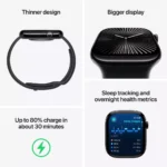 ميزات صحية ولياقية متقدمة توفر رؤى قيّمة، وميزات أمان تبقيك على اتصال بالمساعدة عند الحاجة. يدعم الشحن السريع ليمنحك 80% من البطارية في حوالي 30 دقيقة. يمكنك إجراء تخطيط للقلب (ECG) في أي وقت، والحصول على إشعارات إذا كان معدل ضربات قلبك مرتفعًا أو منخفضًا أو إذا كان لديك اضطراب في النبض. يمكنك أيضًا تتبع دورتك الشهرية والحصول على تقديرات للإباضة بأثر رجعي، ورؤية مؤشرات الصحة أثناء النوم مثل معدل ضربات القلب ومعدل التنفس والمزيد عبر تطبيق Vitals، بالإضافة إلى تتبع النوم والحصول على إشعارات في حال اكتشاف علامات انقطاع النفس أثناء النوم.