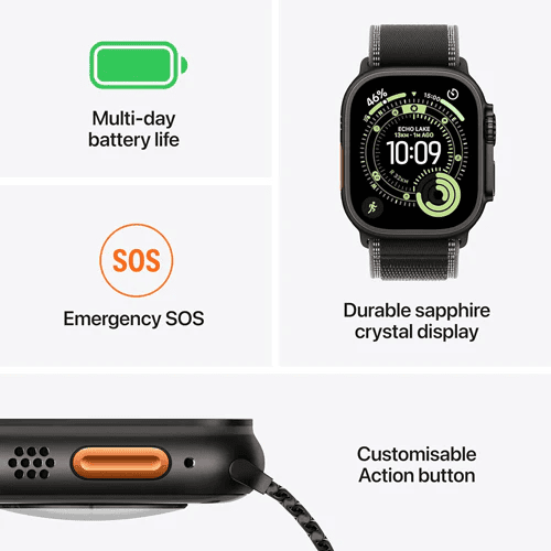 The Apple Watch Ultra 3 is the pinnacle of Apple’s smartwatch lineup, engineered for extreme sports and adventure. It features a robust titanium case, the brightest display ever on an Apple Watch, and new satellite communications for off-grid messaging. With an extended multi-day battery life and advanced health tracking, it’s the most capable and durable Apple Watch to date.Every Apple Watch Ultra 3 comes with a titanium case and a choice of bands designed for specific activities: