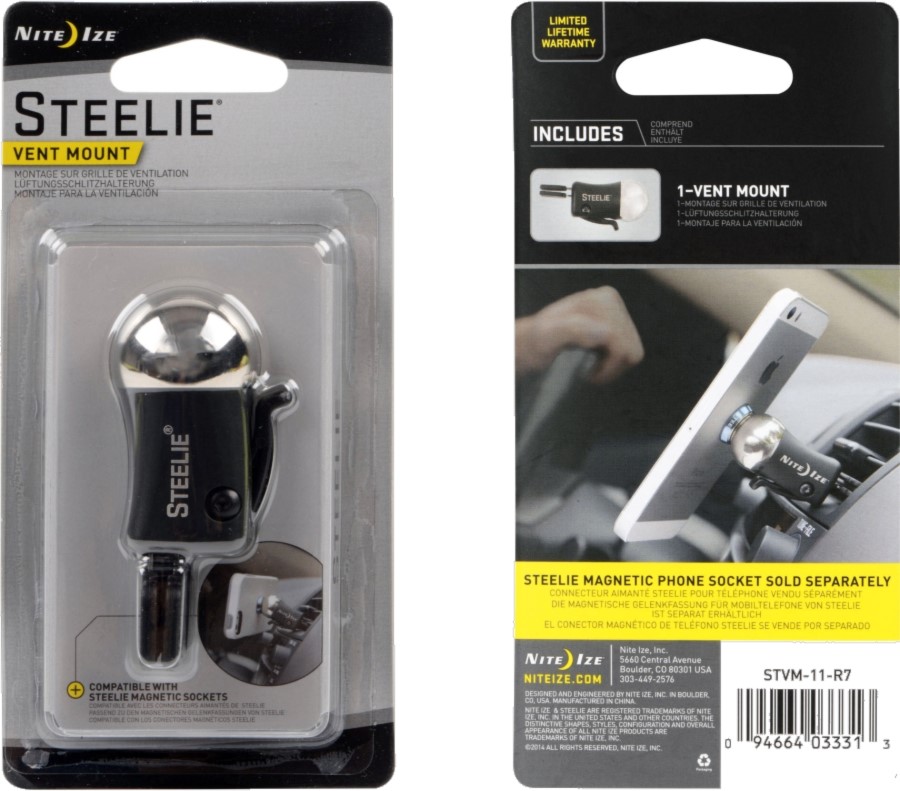 The Steelie Vent Mount Kit is a brilliant solution for keeping your smartphone secure and visible when you’re in the car – any car. It consists of two simple components: 1) a Steelie Magnetic Phone Socket that adheres semi-permanently with 3M® VHBT foam tape, either to the back of your case or to the phone itself, and 2) a versatile Steelie Vent Ball Mount that securely clips to most vehicle vents, and is just as easy to unclip, so it can be used in multiple vehicles. The Vent Ball’s round shape allows radiant positioning options, so you can tilt your phone to any angle, and the strong magnetic attachment of the Steelie Phone Magnet Socket keeps your phone securely in place and where you need it.