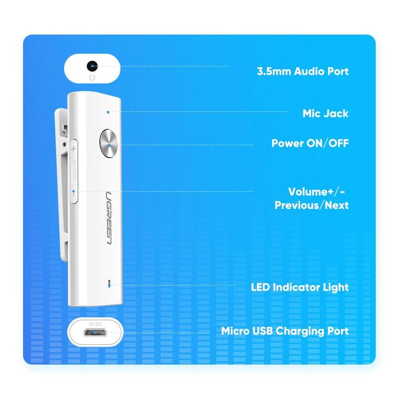 Bluetooth receiver: UGREEN Bluetooth adapter 5.0 is designed for non-Bluetooth car/home stereo system with 3.5mm aux port. 10m barrier-free transmission. The back clip allows this adapter to stay wherever you want.