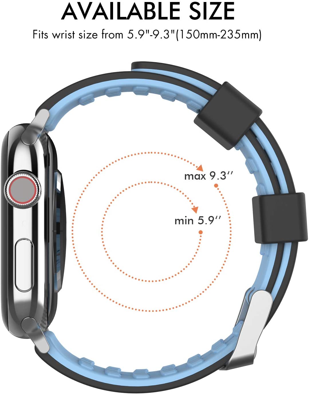 This watch band fits all iWatch models:Series SE/6/5/4/3/2/1(42/44mm), fits wrist size from 5.9″-9.3″(150mm-235mm).Two layers of different color bands fused together, makes your iwatch unique and suitable for men, women, boys and girls.Designed for all occasions, heat dissipation grooved design on the underside to keep the wrist breathable and dry.Made from soft silicone and specially treated with UV to give the band a smooth finish, easy to clean and offer you an excellent wearing experience.Each band comes with stainless steel Lugs on both ends, which can lock onto your iWatch interface precisely and securely.