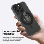 Professional Protection Engineered to deliver exceptional defense with a transparent PC backplate, offering robust protection against UV rays and chemicals for all-weather resilience.AI Engineered ergoFRAME™ Utilizes cutting-edge AI technology in design and testing, ensuring a perfect balance of protection and ergonomic comfort.DefendEdge™ Lens Protection Provides comprehensive protection for your iPhone’s camera lens, shielding it from scratches and impacts.Integrated Grip Ring Enhanced with a sturdy, built-in ring for a secure grip and versatile kickstand functionality, offering convenient hands-free viewing.10ft Drop-Test Certified Rigorously tested to withstand drops from up to 10 feet, providing confidence in everyday use.German Anti-Discolouration Technology Prevents yellowing, keeping your case clear and pristine over time.MagSafe-Ready Fully compatible with MagSafe technology, ensuring seamless wireless charging and secure attachment of MagSafe accessories.Infinity View Maintains a sleek, ultra-thin profile for an unobstructed view and comfortable handling.Universal Cable Fit Designed to easily accommodate all types of charging cables.Phone Strap-Ready Ready for attaching a phone strap, adding extra security and convenience for on-the-go use.