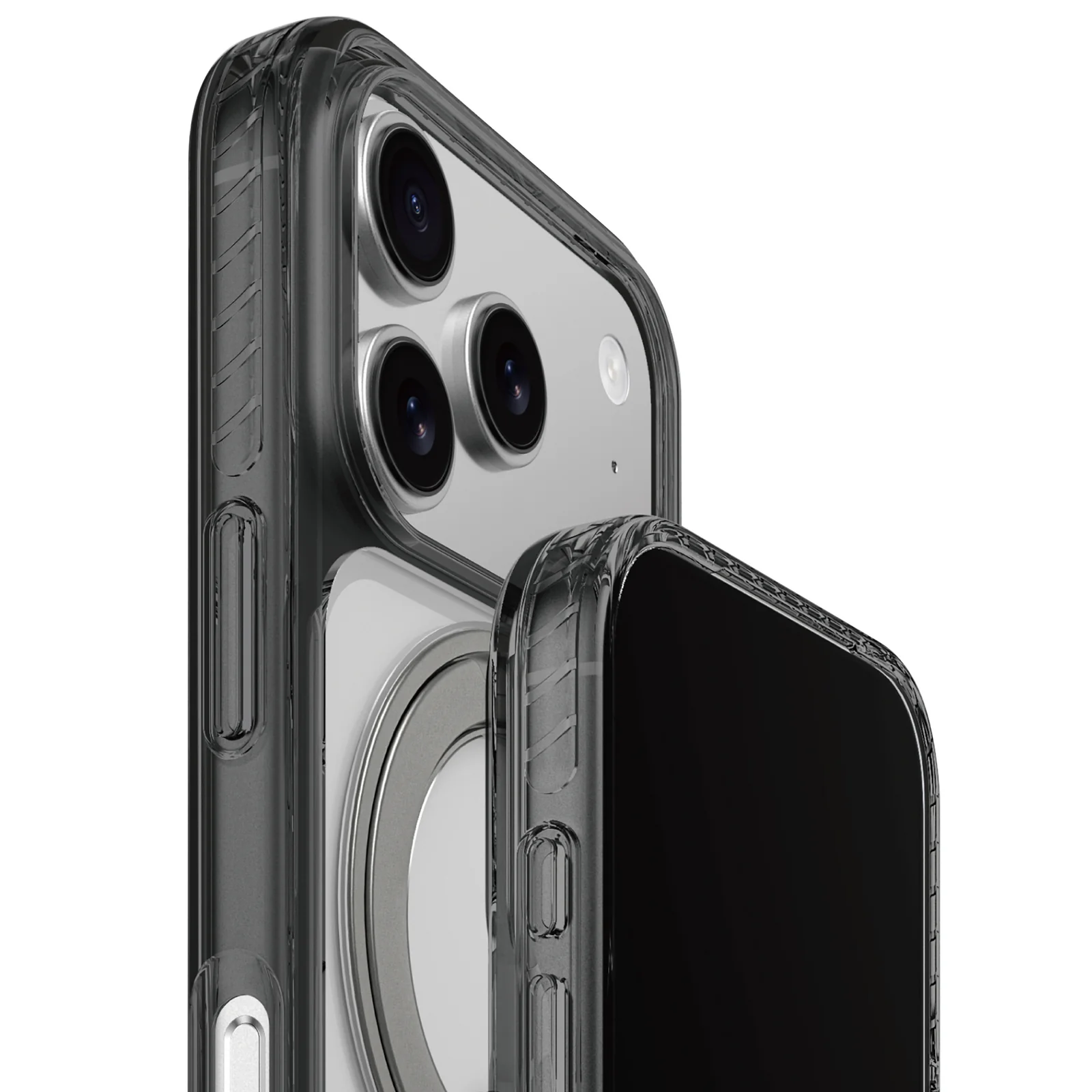Titan Pro MagSpin is a practical case built for everyday use. With reinforced corners and X-CUSHION PRO 7 cushions, it defends against drops up to 12 feet. Anti-yellowing TPU maintains lasting clarity, while a built-in 360° magnetic ring stand offers smooth rotation, stable grip, and MagSafe support.X-CUSHION PRO 7 cushions are embedded along both sides of the case, working with reinforced corners to absorb and redirect impact from every angle. Drop-tested to 12 feet, this structure delivers dependable protection while staying slim and comfortable in the hand.Made from high-quality TPU with anti-yellowing properties, the case resists discoloration from UV and oxidation. The material remains crystal clear over time, preserving the original look of your phone and maintaining a polished, like-new appearance through daily use.The built-in ring rotates smoothly in all directions, allowing for hands-free viewing in both vertical and horizontal positions. It supports MagSafe compatibility for secure mounting and folds flat when not in use, adding grip and function without extra bulk.A carefully raised frame surrounds the camera area to keep lenses lifted away from flat surfaces. This subtle elevation helps reduce scratches and smudges from everyday placement, providing extra durability without disrupting the clean, minimalist back design.