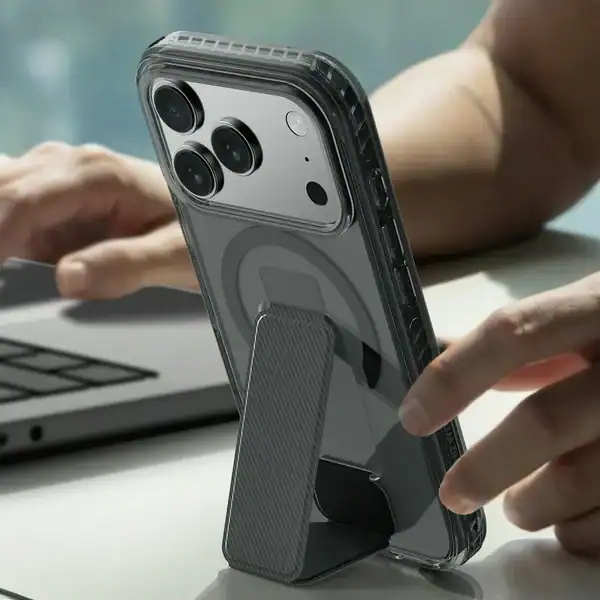 Titan Pro+ delivers reliable hands-free support and advanced drop protection in one streamlined form. A fold-out holder offers steady viewing at multiple angles, while reinforced corners and X-CUSHION PRO 7 side cushions shield the device from drops up to 12 feet. Anti-yellowing TPU preserves long-term clarity, and Capture Button access ensures smooth control.Reinforced corners and side-embedded X-CUSHION PRO 7 cushions work together to absorb and redirect shock from all directions. Drop-tested to survive falls from up to 12 feet while maintaining a slim profile and secure grip for confident, everyday use.Made from durable TPU with built-in anti-yellowing properties, the case maintains long-term transparency. Engineered to resist UV light and oxidation, it stays clean and clear even through extended daily use.The built-in holder unfolds into a stable kickstand that supports both vertical and horizontal viewing angles. When not in use, it folds flat into the case to maintain a smooth, streamlined profile and offers added flexibility without extra bulk.Features a built-in button structure aligned with the iPhone’s Capture Button, enabling quick, responsive photo and video control without removing the case. Designed for smooth functionality and consistent performance.