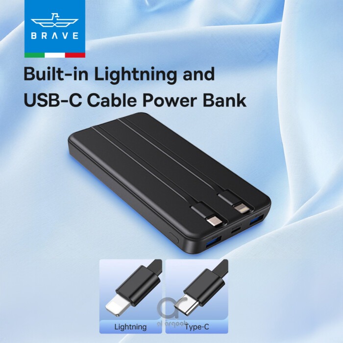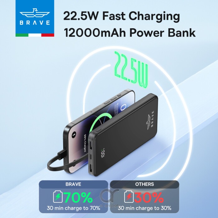 BRAVE 12000mAh Power Bank with 22.5W Fast Charging, Built-in USB-C & Lightning Cables, LED Display