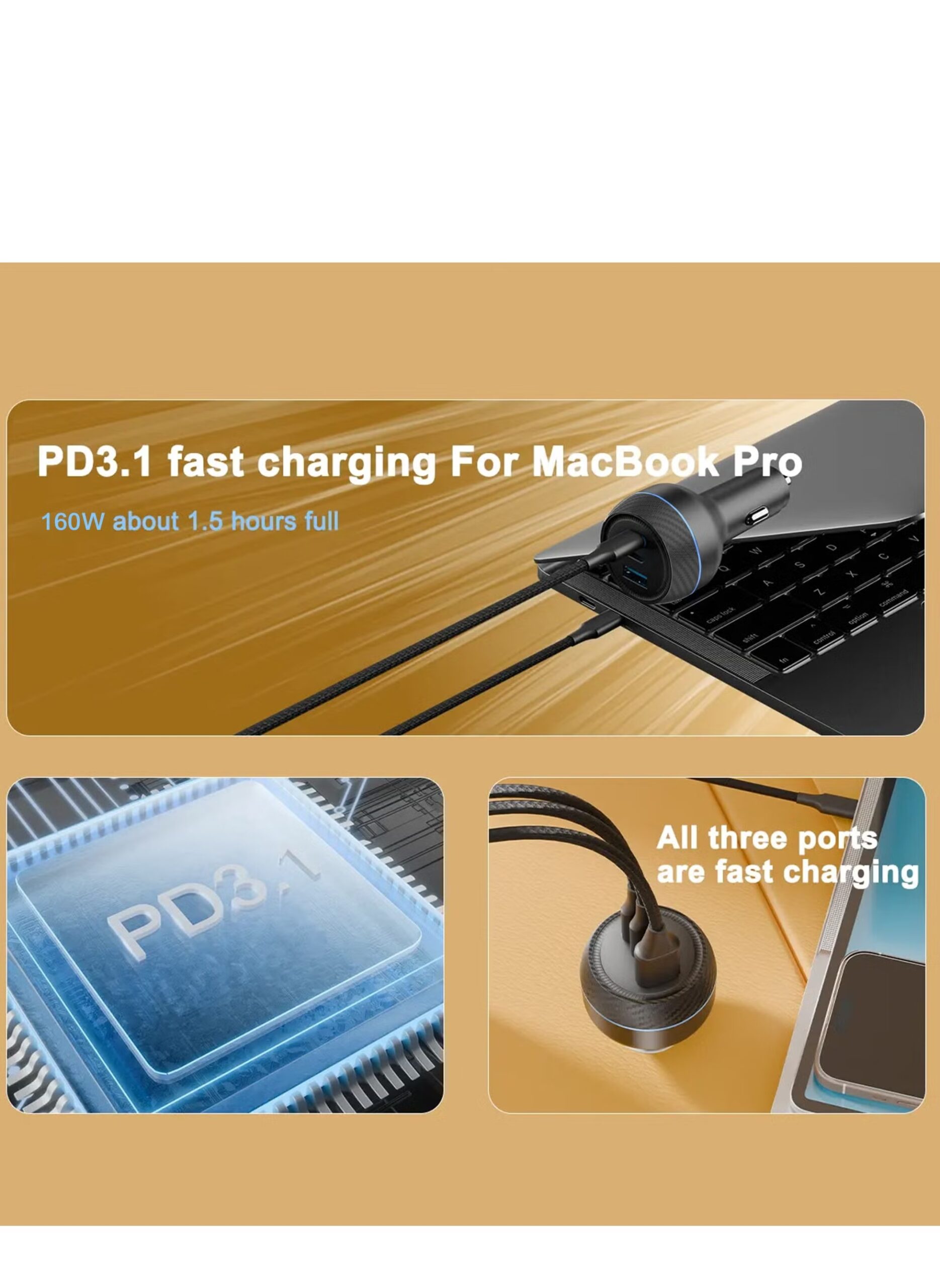 Introducing the innovative 160W USB-C Car Charger, featuring cutting-edge PPS, PD3.1, and QC3.0 fast charging. With three independent ports (100W+30W+30W), it delivers optimal power without reducing output, allowing you to charge three devices simultaneously at lightning speed. Perfect for all your on-the-go charging needs.The BRAVE 3-port USB-C car charger adapter allows you to charge three devices at full speed simultaneously, perfectly accommodating your multi-device needs. Whether you’re powering up your phone, tablet, or laptop, this charger ensures everyone stays connected and charged while on the go.The high-power USB-C car charger offers a robust 100W output from USB-C1, specifically engineered for fast charging a wide range of laptops, including MacBook, Dell, Acer, HP, Lenovo, ThinkPad, ASUS, and Samsung. Stay powered up on the road and ensure your devices are always ready for action.The fast car charger type C accessories set includes a 1-meter 100W USB-C to USB-C cable, saving you the time and hassle of searching for an extra cable. Simply plug it in to enjoy super-fast charging for your devices, making on-the-go power effortless and convenient.The BRAVE car charger adapter features an intelligent circuit design that ensures optimal safety for your devices. Certified RoHS, CE, and FCC compliant, it protects against overheating, over-currents, and short circuits. Charging automatically stops when your battery is full, providing peace of mind while you drive.The advanced PC material body with a sleek carbon fiber finish is scratch-resistant, ensuring your car phone charger stays looking brand new. The thoughtfully designed soft LED light makes it easy to locate the charging port in the dark, enhancing usability and convenience.The BRAVE USB charger is fully compatible with a wide range of devices, including the iPhone 16 Pro/Max/Plus, 15 Pro Max, and earlier models down to the iPhone 8 Plus. It also supports MacBook Pro (16″/15″/13″), MacBook Air (13″/11″), Air Pods, Chromebooks, drones, and various iPad models. Additionally, it works seamlessly with Samsung Galaxy S24/S23/S22/S21 Ultra and Tab S8, as well as laptops from Lenovo, Dell, HP, Google Pixelbook, and more. You’ll also find it compatible with brands like HTC, LG, Nokia, Motorola, Sony, and even the Kindle Fire HD 10 and Steam Deck. Enjoy universal charging convenience with BRAVE.