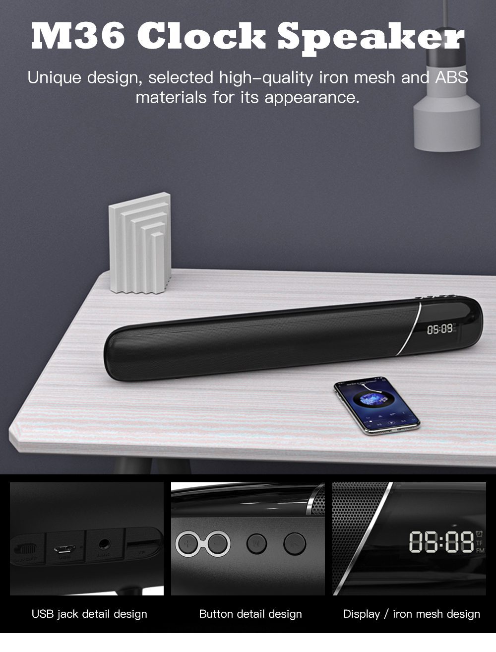 The fashion runway round belt has a generous and generous design. The sound quality has been adjusted several times, and the three-frequency balance is clear. Full-featured: Bluetooth, call, TF card, FM radio, AUX, clock, alarm clock.bluetooth version: bluetooth 4.2 bluetooth transmission distance: 10M Impedance: 4Ω Sensitivity: 88dB ±3dB Frequency response range: 90Hz-20KHz Speaker specifications: 52mm Output power: 5W*2 Rated power: 5W*2 THD+N ≤10% (1KHz/0dB) Battery specifications: lithium battery 3.7V/2000mAh Charging voltage: 5V/1A Product size: L491*w68*H73mm Product weight: g Standby time: 36H Play time: about 7-8H (60% volume) Support functions: Bluetooth, call, TF card, FM radio, AUX, clock, alarm clock. Distortion: ≤1% Signal to noise ratio: ?65dB Color: black, white