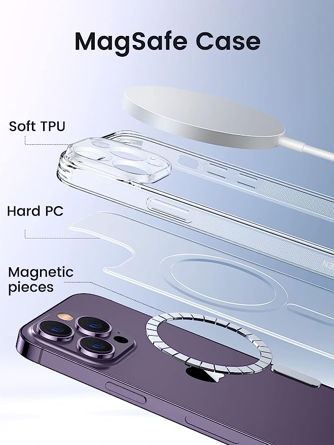 The iPhone case is compatible with iPhone 14 Pro Max 6.7 Inches 2022.The iPhone 14 Pro Max Magsafe case has 38pcs built-in magnet, ensuring a great electricity connection when charging your phone with the case on.The iPhone 14 Pro Max clear case is made of premium TPU. Always like brand new. Erase your worries about yellowing.The iPhone 14 Pro Max case fully covers your new iPhone and even the camera lenses are well protected.