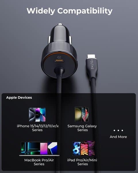 60W Dual USB-C Fast Charging with PD 3.0 Support- Charge two USB-C devices at high speed simultaneously using advanced Power Delivery 3.0 technology. This car charger provides up to 60W of total output—enough to power smartphones, tablets, and even USB-C laptops like the MacBook Pro during travel or daily commutes.