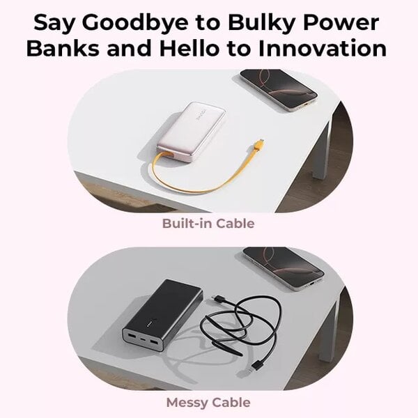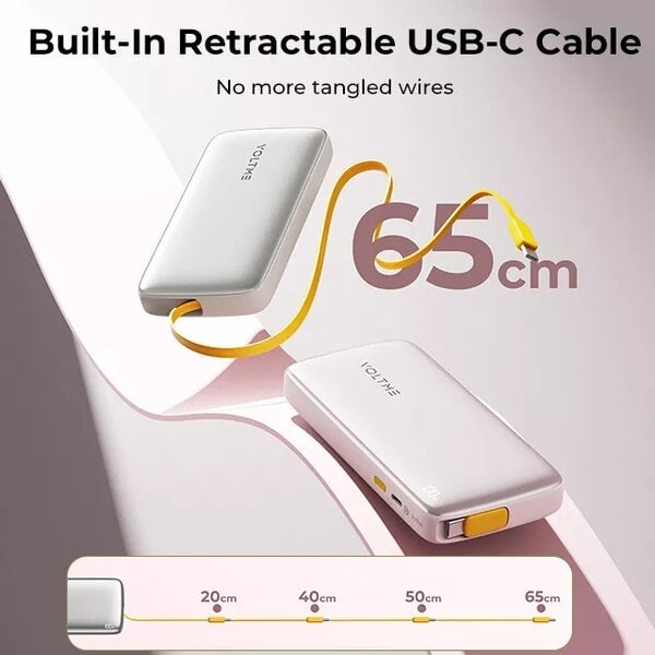 [Built-In 65cm USB-C Cable — Tangle-Free Charging] Forget tangled wires. The retractable 65cm cable smoothly pulls out, charges your device, and snaps back into place magnetically—built right into the sleek power bank.