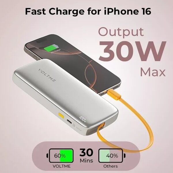 [30W Max PD Fast Charge — Power in Minutes] Charge iPhone 16 to 60% in 30 minutes. Supports both 25W input and 30W output via built-in cable and USB-C port for high-speed recharging and output
